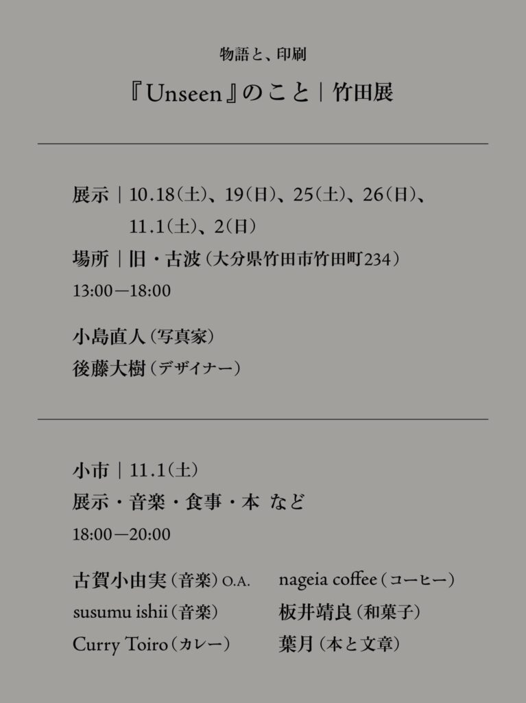この夏、大分市の高山活版社で開催された「物語と、印刷 第2回『Unseen』のこと」。好評をいただいた本展をこのたび、竹田でも開催させていただくことになりました。