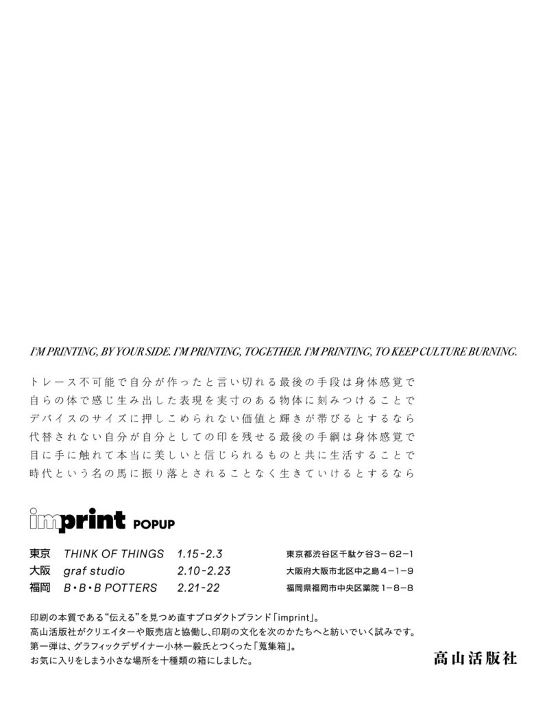 今年は新ブランド「imprint」を通してたくさんの人に私たちのものづくりを知っていただきたく、全国各地を回りたいと思っています。ぜひ会場で実際に印刷物を手に取ってお楽しみいただけるととても嬉しいです!