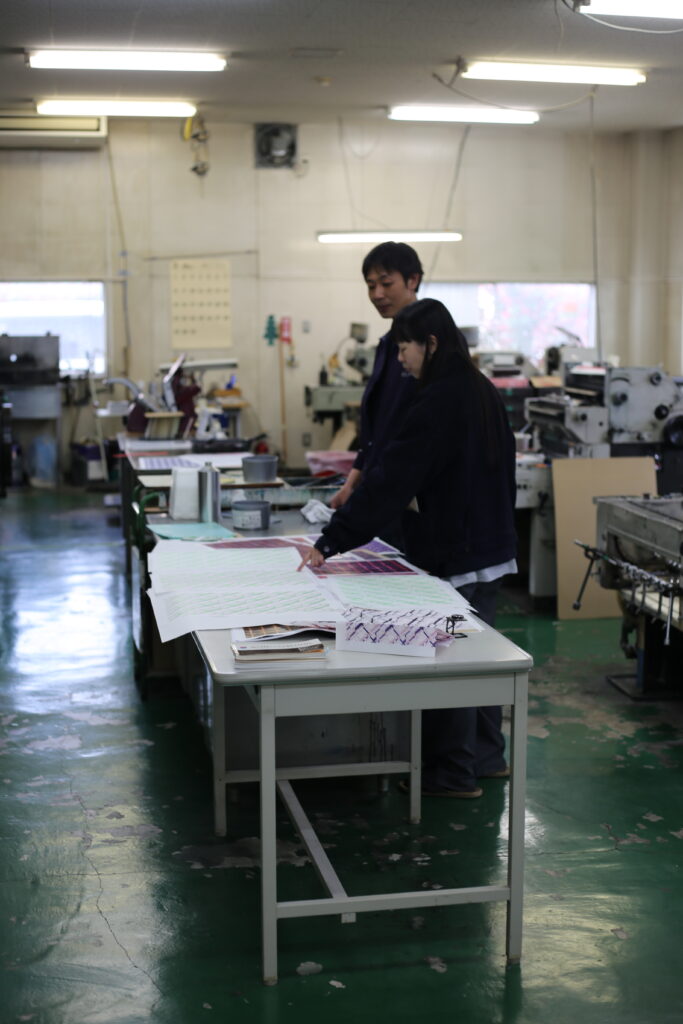 年度末が差し迫り、なんとなく気忙しい3月の最終週。 東京からデザイナーのサリーン・チェンさんが来社してくださり、テスト刷りをさせていただきました。実際の紙にインキを刷ってみてわかることって、実はたくさんあります。今回も刷り色や紙の透け感など思いがけずいろいろな発見があり、そこから新たなアイデアが湧いたりして、これからどんな印刷物が生まれるのか?今からとても楽しみなところです。